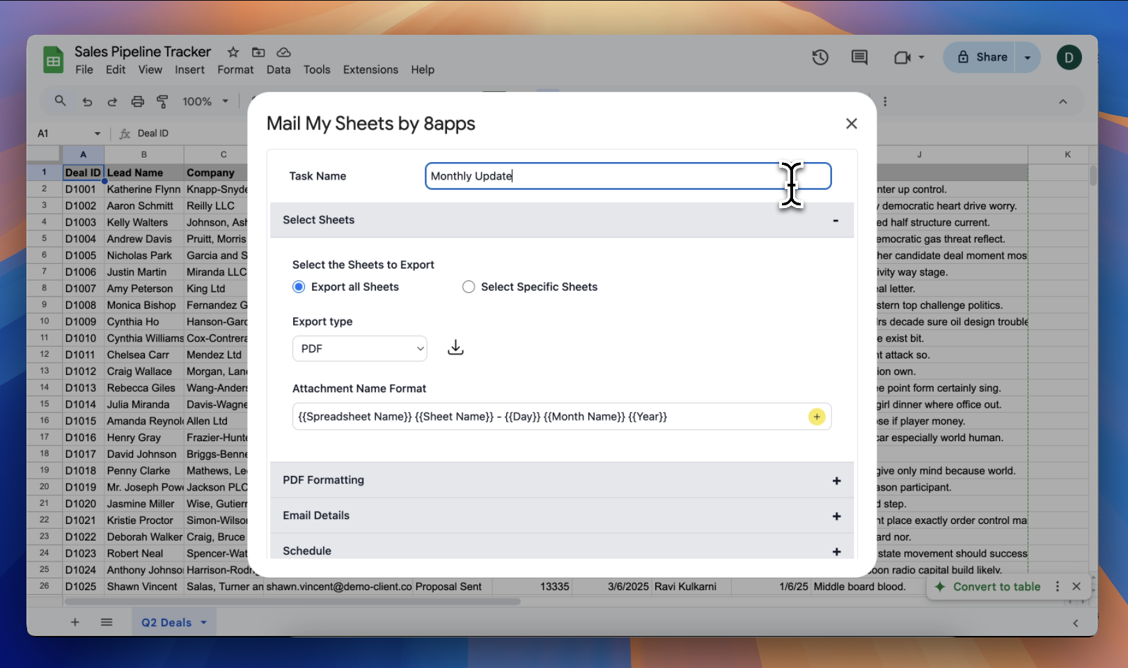 | Select Sheets | Send as a PDF, Excel or CSV attachment |
