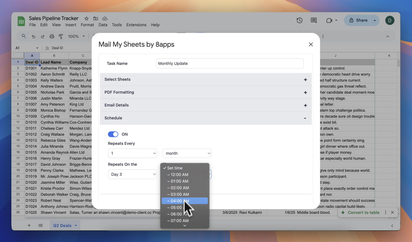 Mail My Sheets offers flexible and highly customisable scheduling options to automate email delivery exactly when you need it.